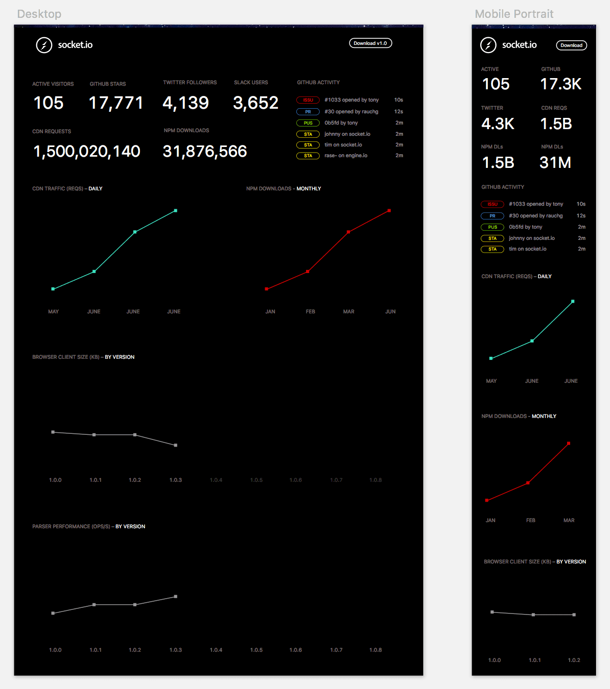 We can think of the example above as the same Socket.IO dashboard() UI function but with different parameters. The
