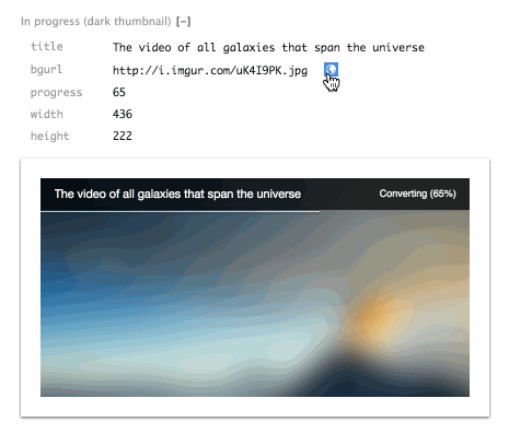 When a parameter is recognized as an image, an extra link is added to retrieve a random image from imgur. It turns out that light images were actually not very friendly to the particular design I picked for the progress bar, and it had to be revisited. Adding some shadows made it perform well with a wide range of photos:
