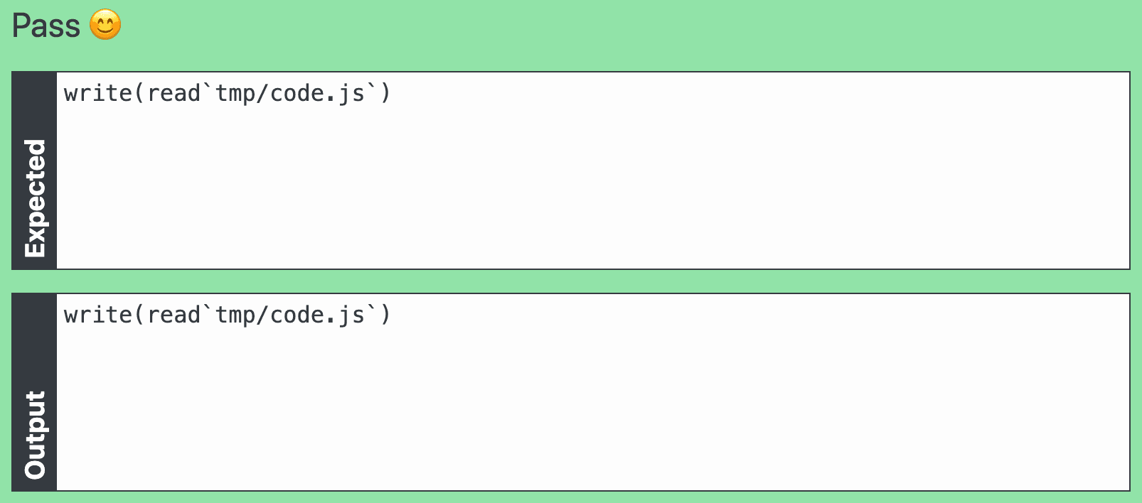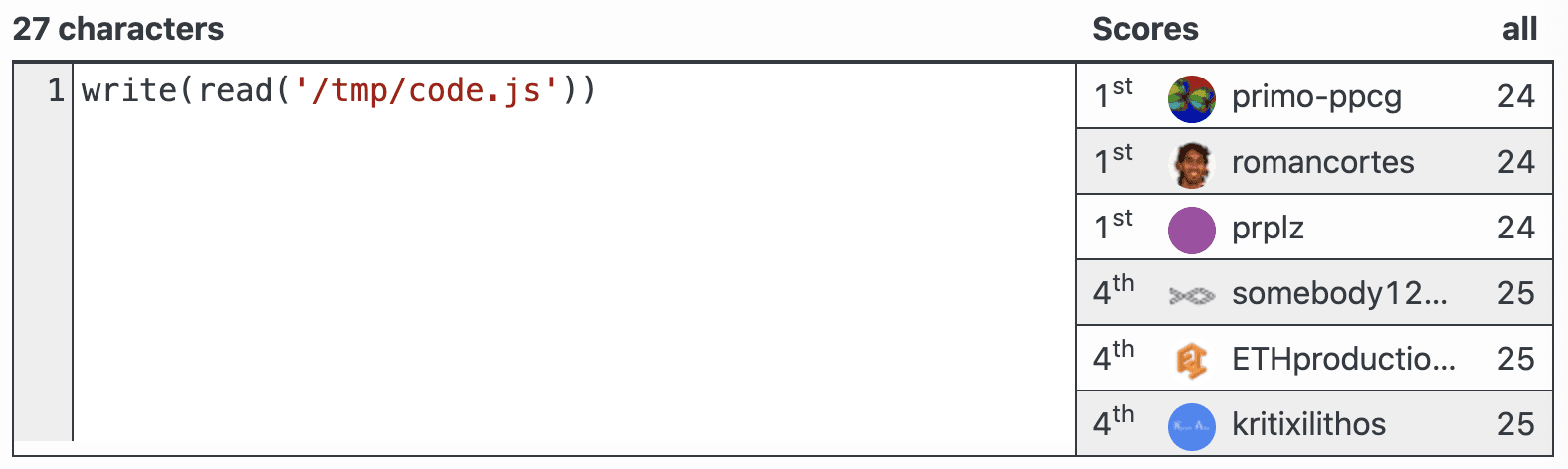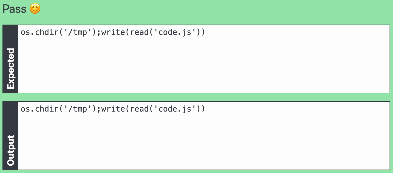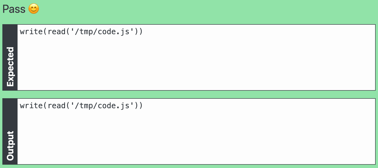 I connected the pieces: my first clue (/tmp/code.js), write and read. A beautiful Quine was born: