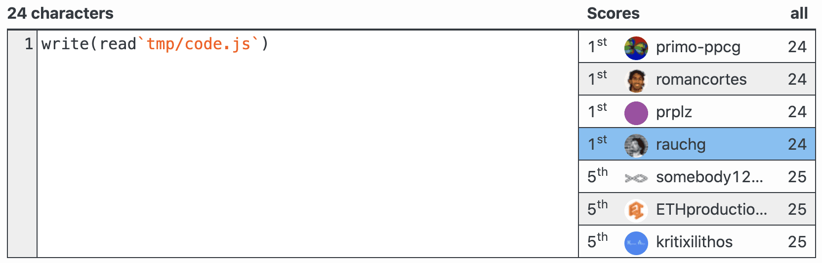 With those two characters gone, I cemented my one and only contribution to the annals of code-golf.io as the permanent 4th 1st-place π :