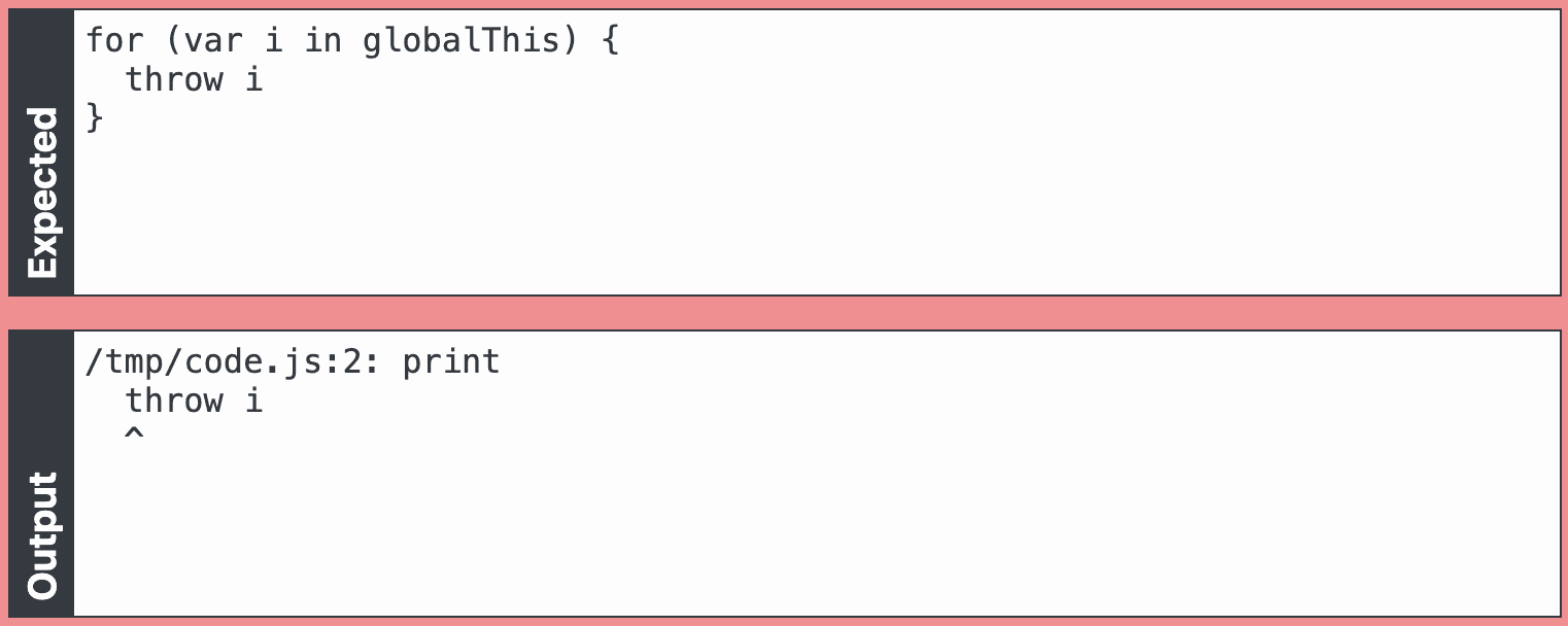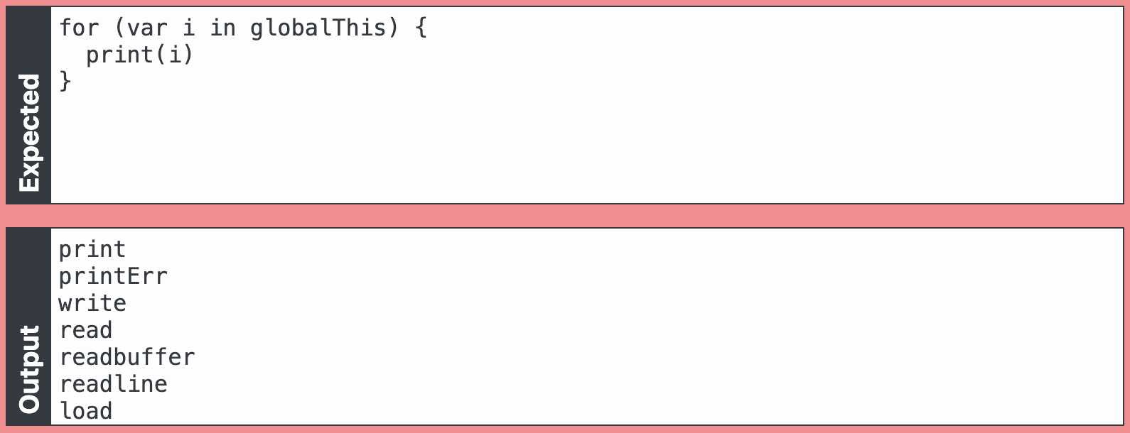 To my delight: globalThis was defined, which surprisingly indicated a very recent JS environment, and the first member I enumerated was called print. Eureka! That sounds really useful.