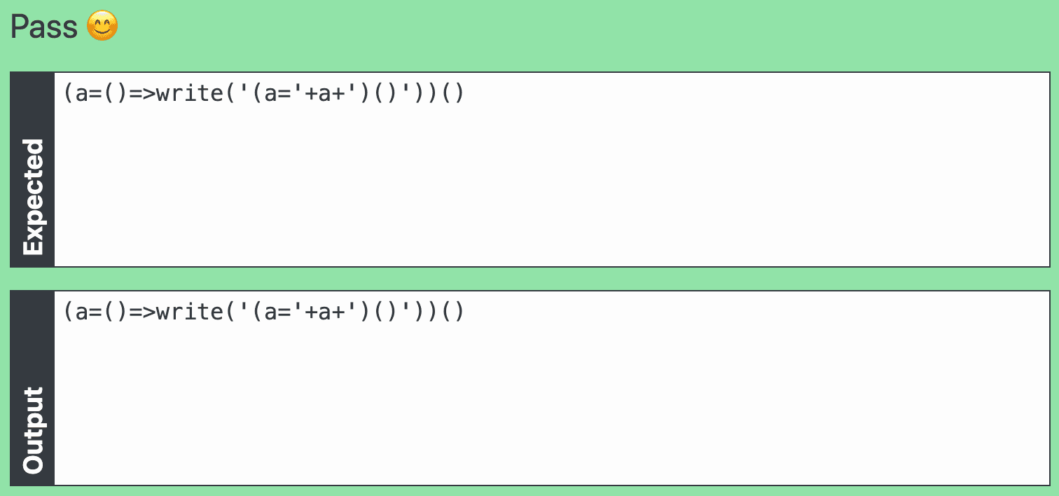 Notice that code-golf.io was expecting write('write()')) but we just gave it write(). No matter what we write in that string, we'll always be one layer removed from success. We'll need to go deeper.